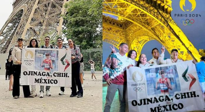 Chihuahua.- Bajo la Torre Eiffel se pudo ver una manta chihuahuense para apoyar a la marchista Alegna González.