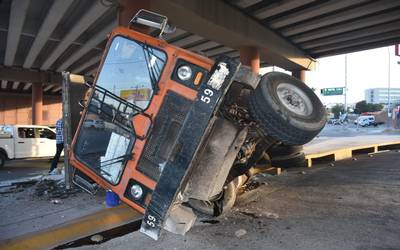 El conductor de la unidad señaló que se quedó sin frenos y al virar en el retorno se volcó, los pilares del puente sostuvieron la pesada unidad.