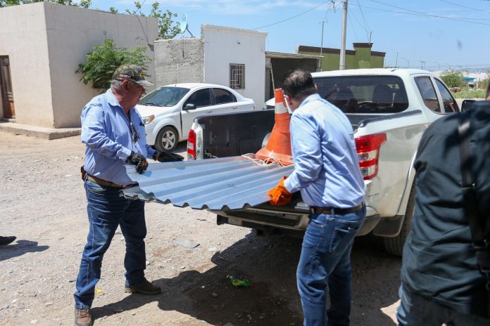 Delicias.- El alcalde Jesús Valenciano entregó láminas a familias de la colonia Laderas del Norte, cuyas viviendas resultaron dañadas de sus techos tras la intensa lluvia de la tromba que azotó la ciudad el pasado 22 de julio.