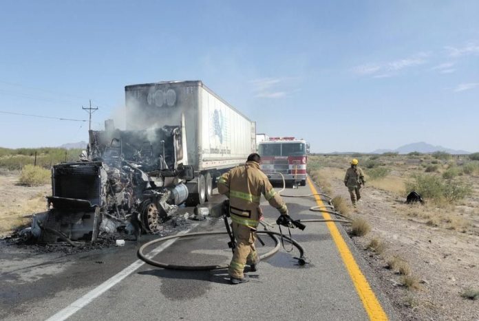 Chihuahua.- Elementos de la Guardia Nacional, cerraron el sentido norte a sur de la carretera Ciudad Juárez-Ahumada, debido al incendio en la cabina de un tractocamión, ocurrido a la altura del kilómetro 260, informó la Coordinación Estatal de Protección Civil (CEPC).