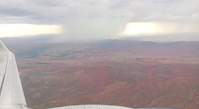 Desde la ventanilla del avión, pasajeros captaron fotografías de cómo se veía el torrente de lluvias cayendo sobre sectores de la ciudad de Chihuahua, impidiendo el aterrizaje en esos momentos.
