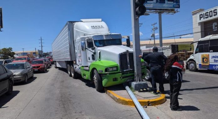 Chihuahua.- Este sábado cerca de las 2:00 de la tarde, un accidente vial se registró justomente en el cruce de las calles Tecnológico y Agustín Melgar, al momento en el que un tráiler se quedó sin frenos y terminó por estrellarse contra un poste de luz y un semáforo, no se presentaron lesionados.