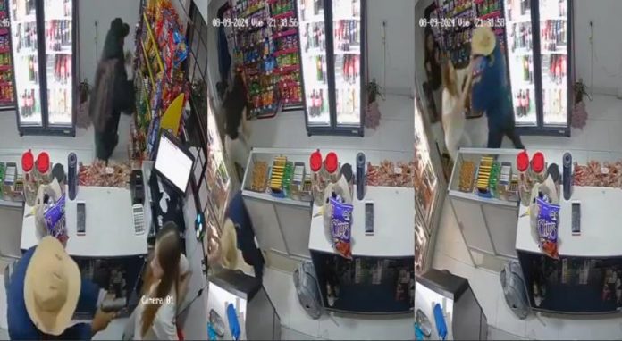 Otra jovencita sale del interior de la tienda y se da cuenta de que sucede el asalto, misma que intenta llamar a la víctima de robo para que se ponga a salvo.