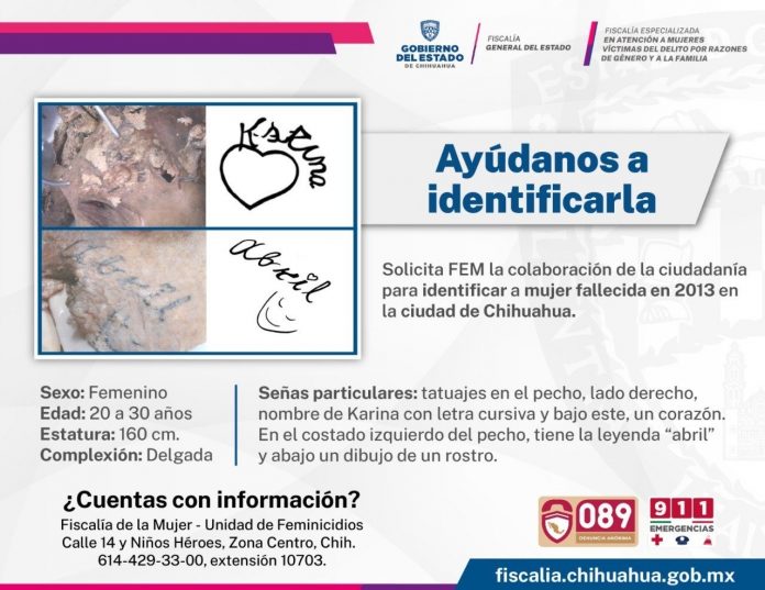Esta fiscalía solicita que, si alguna persona puede aportar información o conoce a algún familiar, acuda a la Unidad de Feminicidios de Fiscalía de la Mujer, ubicada en la calle 14 #114, cruce con Avenida Niños Héroes, Zona Centro o puede llamar al 614-429-33-00, extensión 10703, a fin de obtener elementos de confronta con familiares.