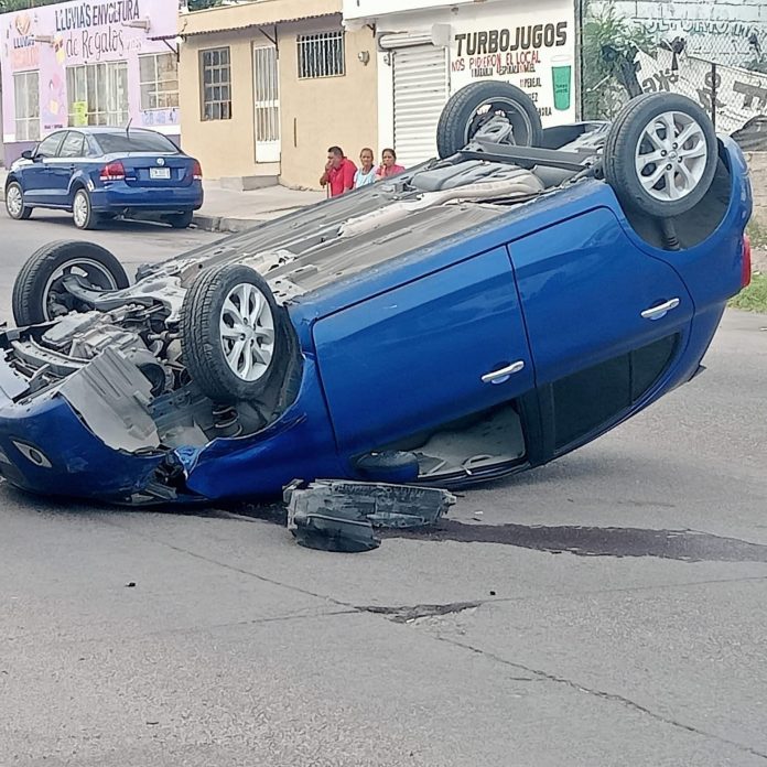 Choque con volcadura en Delicias: mujer y menor resultan ilesos