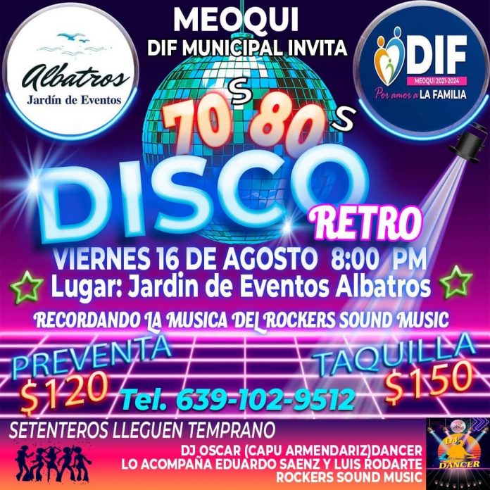 Meoqui.- Este viernes en Meoqui, se llevará a cabo el Baile Retro por parte del DIF Municipal, en el Salón Albatros a partir de las 8 de la noche, donde los meoquenses podrán disfrutar de buena música de los 70´s y 80´s esto para recaudar fondos para la reubicación de la UBR (Unidad Básica de Rehabilitación) a las instalaciones del DIF.