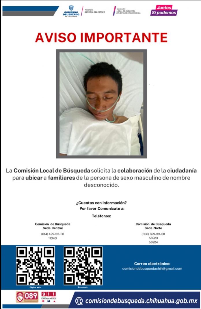 Chihuahua.- La Comisión Local de Búsqueda ha emitido un aviso importante solicitando la colaboración de la ciudadanía para ubicar a los familiares de un hombre de sexo masculino cuyo nombre aún es desconocido.