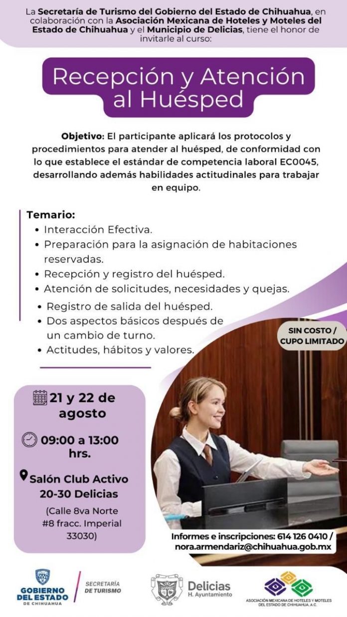 Delicias.- Como parte de la alianza entre la dirección de desarrollo económico y agropecuario con La Secretaría de Turismo del Gobierno del Estado de Chihuahua y en colaboración con la Asociación Mexicana de Hoteles y Moteles del Estado de Chihuahua, se impartirá el curso: