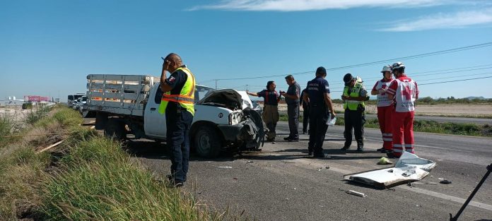 Delicias.- Un fuerte accidente ocurrió en la carretera federal a la altura del Grove, involucrando a dos camionetas tipo pick-up de color blanco.