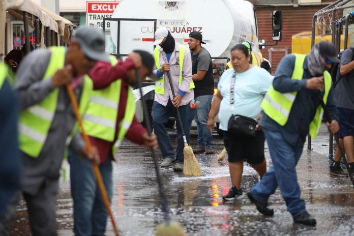 Ciudad Juárez.- Personal de la Dirección de Limpia realizó un operativo en la Zona Centro de la ciudad, en coordinación con 200 comerciantes y 30 voluntarios de la Asociación Civil Fondo Unido Chihuahua, quienes se unieron a la décimo tercera Cruzada por el Centro Histórico.