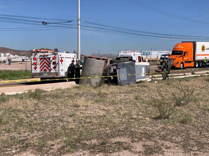Chihuahua.- Hoy, en la gaza del Periférico R Almada, a la altura de las calles 120 y Silvestre Terrazas, se produjo un trágico accidente cuando una máquina aplanadora cayó de un tráiler de plataforma de cama baja sobre dos trabajadores.