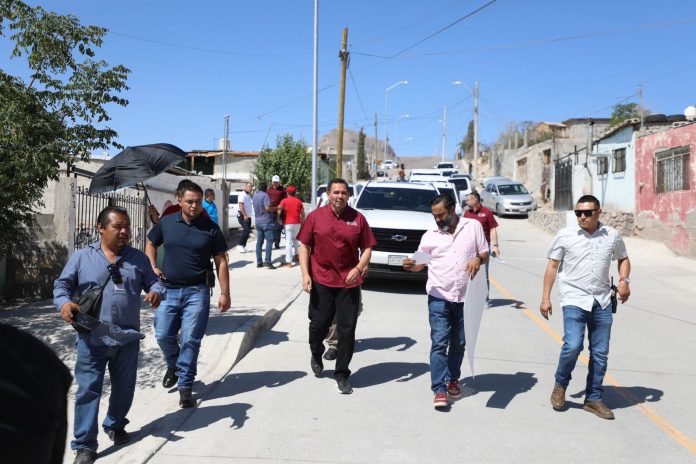 Ciudad Juárez.- Continuando con la entrega de obras del Presupuesto Participativo, esta mañana el Presidente Municipal, Cruz Pérez Cuéllar, entregó a vecinos de la colonia Rancho Palo Chino la calle Calcita, hecha con una inversión de 4 millones 559,479.56.