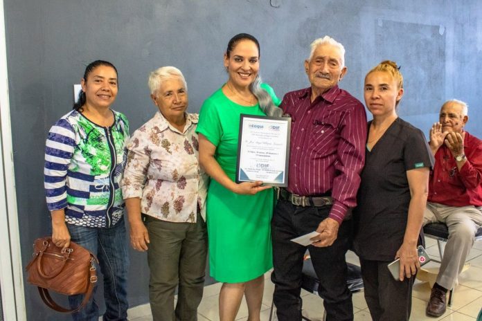 Meoqui.- Continuando con los festejos de la Semana de los Abuelos en Meoqui, se realizó la entrega de reconocimientos y premios a las y los abuelos con más descendencia, resultando ganador el Sr. José Ángel Villezcas Zamudio con 103 miembros de su familia, de los cuales 11 son hijos, 34 nietos, 45 bisnietos y 13 tataranietos. Así como la Sra. Manuela Venegas Esquivel, que, con 96 años de edad, fue la abuelita más longeva registrada en la convocatoria que realizó el DIF Municipal.