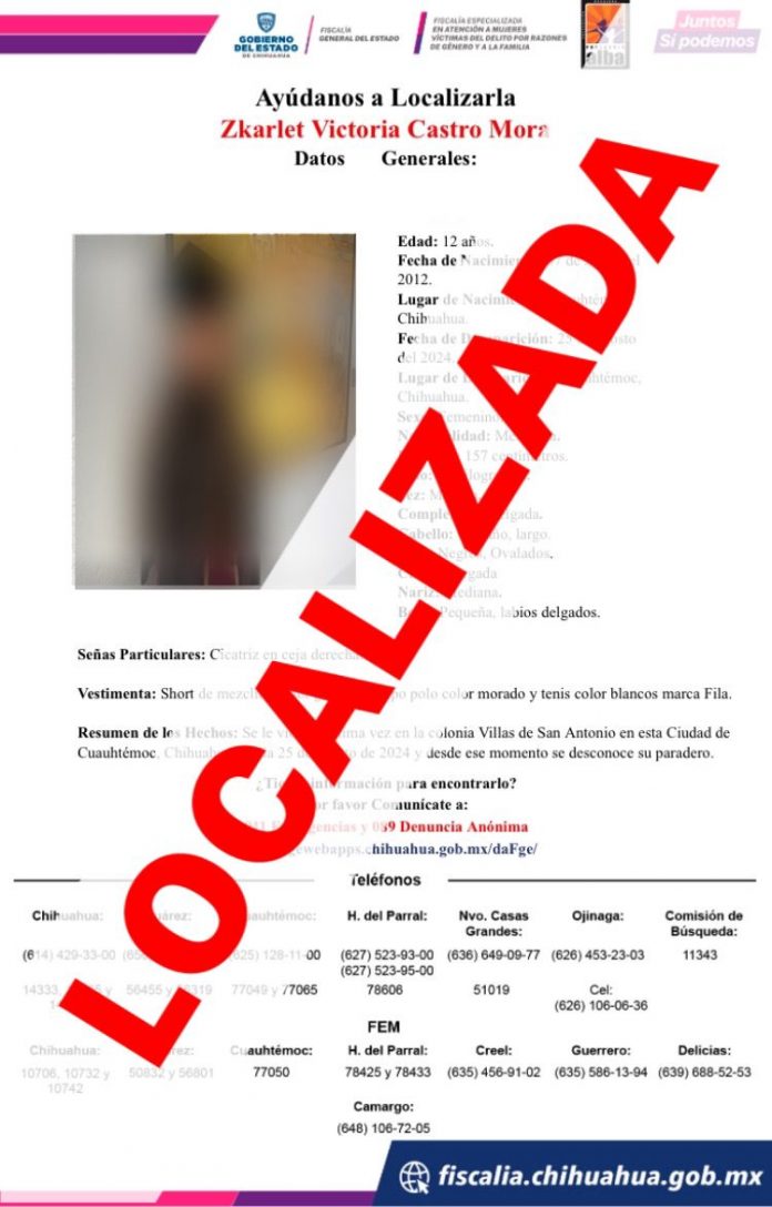 Chihuahua.- Tras permanecer 48 en calidad de desaparecida, Zkarlet Victoria Castro Mora, fue localizada sana y salva por agentes de la Fiscalía General del Estado adscritos a la zona occidente, quienes trasladaron a la menor a las oficinas de la Fiscalía Especializada de la Mujer (FEM) en Cuauhtémoc para los análisis correspondientes que descartaron que fuera víctima de algún delito.