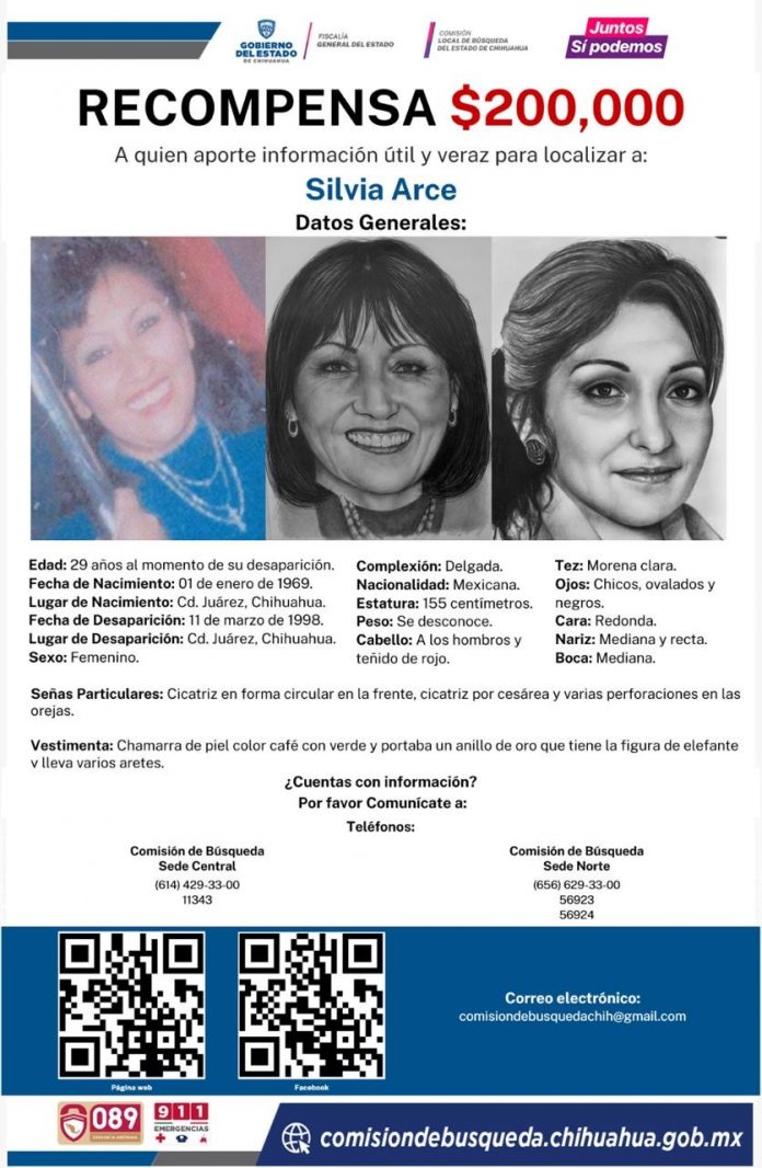 Cd. Juárez, Chihuahua. La familia de Silvia Arce, una mujer de 29 años que desapareció el 11 de marzo de 1998, ofrece una recompensa de $200,000 a quien proporcione información útil y veraz para localizarla.