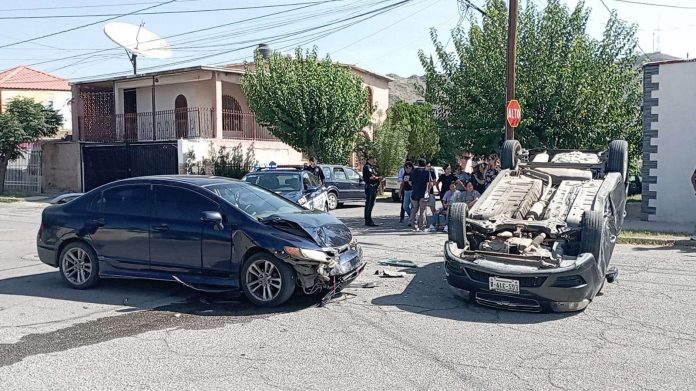 Chihuahua.- Esta mañana, en el cruce de las calles Emilia Miller y Nuevo León, en la Colonia Industrial, se registró un choque con volcadura entre un Chevrolet Aveo de plataforma privada de transporte DiDi y un Honda Civic.