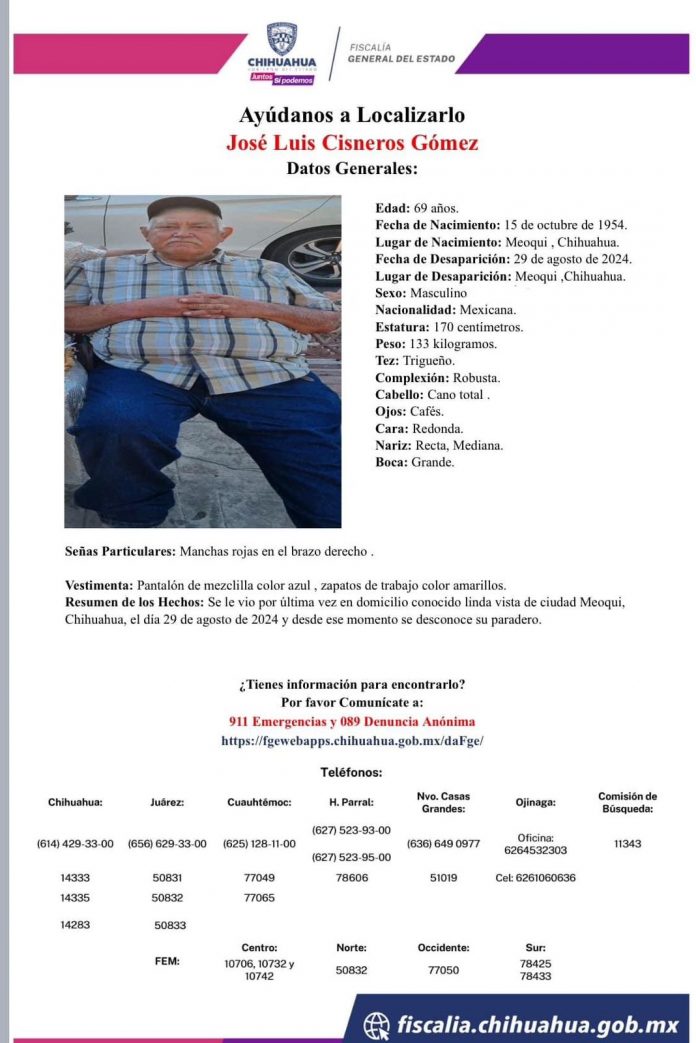Meoqui.- La familia de José Luis Cisneros Gómez, de 69 años, solicita ayuda para localizarlo después de que desapareció el pasado 29 de agosto en Meoqui, Chihuahua.