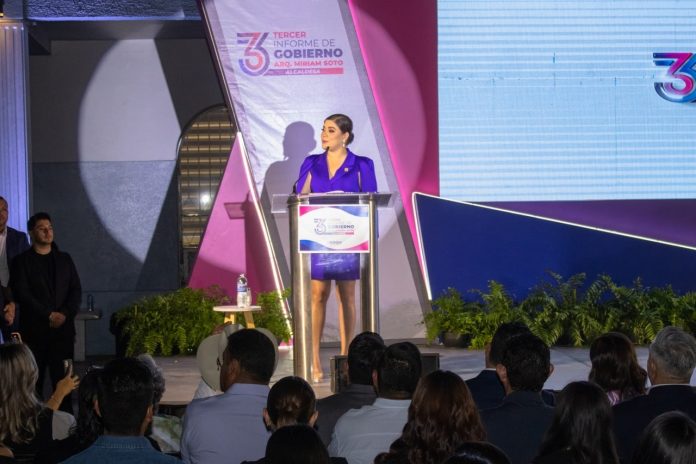 Meoqui.- Ante cientos de meoquenses, así como funcionarios federales, estatales y municipales y los alcaldes y alcaldesas del estado, la Arq. Miriam Soto rindió su tercer informe de gobierno destacando la inversión sin precedente en obra pública, la apertura de 5 Casas de Atención Primaria a la Salud, el fortalecimiento de la Dirección de Seguridad Publica y la reactivación económica tras la pandemia de COVID 19.