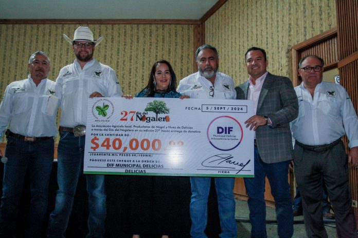 Delicias.- En el marco de la cena de la 27ª edición del Nogalero, la Asociación de Nogaleros de Delicias realizó la entrega de importantes donativos a cuatro instituciones que desempeñan un papel crucial en el apoyo a la ciudadanía en situación vulnerable. Uno de los beneficiarios fue el DIF Municipal de Delicias, cuyo reconocimiento fue recibido por la presidenta del organismo, Alma Limas de Valenciano, y el alcalde de Delicias, Jesús Valenciano.