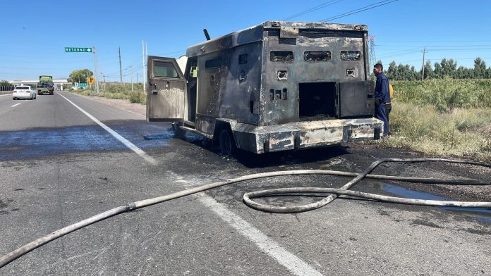 Meoqui.- Este martes por la mañana, cuerpos de rescate se movilizaron con urgencia a la carretera federal #45, en el municipio de Meoqui, después de recibir múltiples llamadas de emergencia que reportaban un camión de valores en llamas.