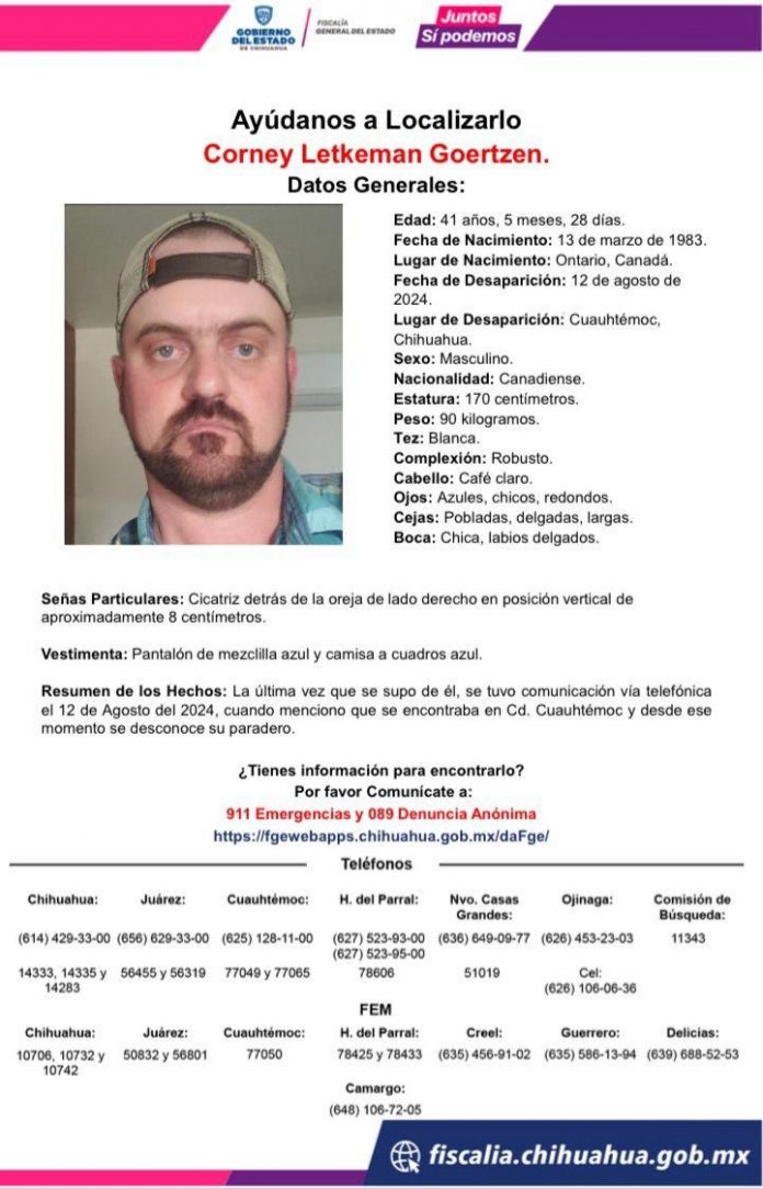 Chihuahua.- La Fiscalía General del Estado solicita el apoyo de la ciudadanía para dar con el paradero de Corney Letkeman Goertzen, de quien se tuvo conocimiento por última vez el 12 de agosto, cuando mediante llamada telefónica indicó que se encontraba en Cuauhtémoc.