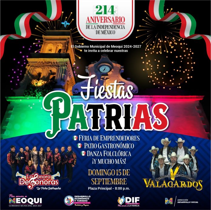 Meoqui.- En el municipio de Meoqui ya se encuentra todo listo para que este próximo domingo 15 de septiembre, a partir de las 8 de la noche, den inicio a los festejos por el 214 Aniversario de la Independencia de México, con un gran ambiente para toda la familia meoquense y de la región.