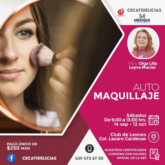 Meoqui.- Este sábado, en el Club de Leones del Seccional de Lázaro Cárdenas, dará inicio un Curso de Automaquillaje de 9 de la mañana a 1 de la tarde, esto gracias a la gran colaboración entre Gobierno Municipal de Meoqui, encabezado por la alcaldesa Miriam Soto y CECATI 142.