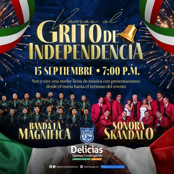 Delicias.- El Gobierno Municipal de Delicias invita a toda la ciudadanía para asistir al tradicional Grito de Independencia este 15 de septiembre a las 7:00 p.m. en la explanada de la presidencia municipal. La celebración contará con música en vivo a cargo de Banda La Magnífica y Sonora Skandalo, quienes amenizarán la noche con un ambiente festivo para toda la familia.