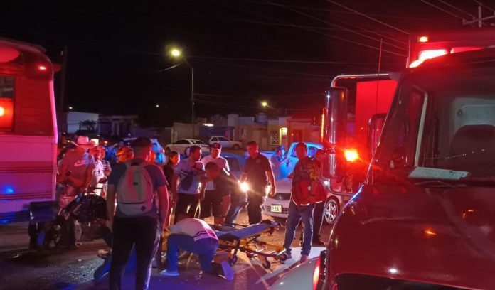 Delicias.- Una colisión entre una motocicleta y un camión de transporte de personal de una maquiladora ocurrió en el cruce de la avenida Solidaridad y la calle Abeto Noble, a la altura del fraccionamiento Cipreses, pasado las 10 de la noche.