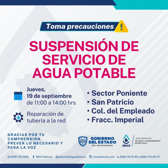 Delicias.- La ciudad experimentará una suspensión temporal del servicio de agua potable este jueves 19 de septiembre, desde las 11:00 hasta las 14:00 horas, debido a reparaciones en la red de distribución.