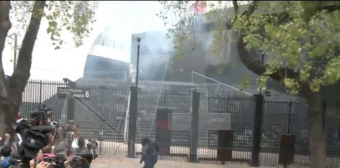 Tras el lanzamiento de los petardos al interior de la Cámara Alta, un grupo de cerca de cien policías se preparan a las afueras del recinto con extintores para repeler cualquier agresión.