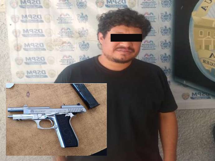 Chihuahua.- Agentes de la Policía Municipal desarmaron y sometieron a un hombre que traía una pistola calibre 9 milímetros, con la cual amenazaba a la familia.