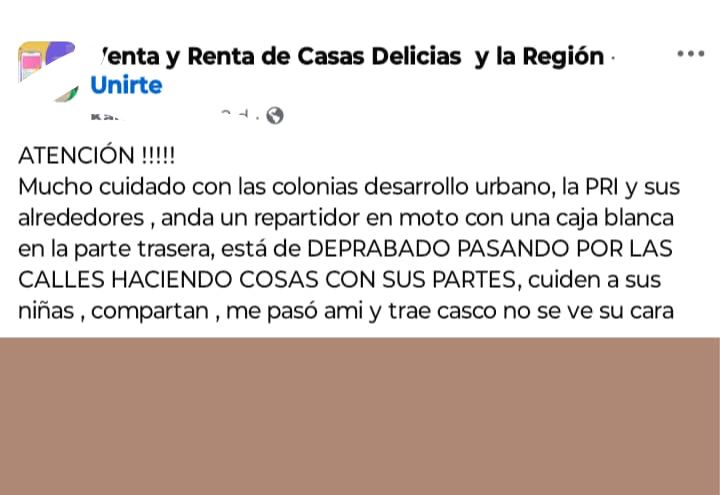Previo a esto, hace dos días el 2 de octubre, en redes se publicó un mensaje que textualmente se lee de la siguiente manera: “ATENCIÓN!!! Mucho cuidado con las colonias Desarrollo Urbano, la Pri y sus alrededores, anda un repartidor en moto con una caja blanca en la parte trasera, está de DEPRAVADO PASANDO POR LAS CALLES HACIENDO COSAS CON SUS PARTES, cuiden a sus niñas, compartan, me pasó a mi y trae casco no se ve su cara”.