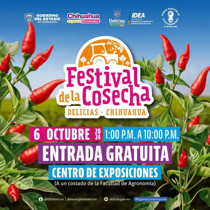 Delicias.- El Gobierno Municipal de Delicias a través del Instituto de Desarrollo Económico y Agropecuario, hace una invitación abierta a toda la comunidad para asistir al esperado Festival de la Cosecha, que se llevará a cabo este 6 de octubre en el Centro de Exposiciones, desde la 1:00 p.m. hasta las 10:00 p.m.