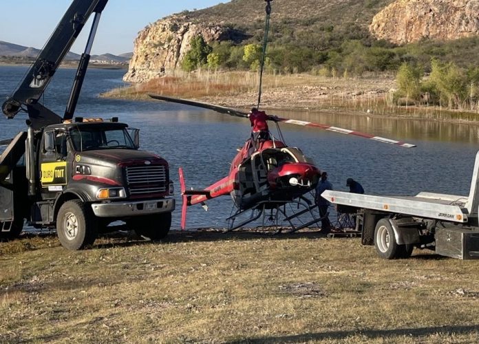 Chihuahua.- La Secretaría de Seguridad Pública del Estado (SSPE), en conjunto con otras instituciones, participó en el operativo para retirar un helicóptero hundido en la presa Chihuahua desde el pasado 5 de septiembre. La aeronave, que realizaba labores de sofocación de incendios, fue localizada a más de 10 metros de profundidad.