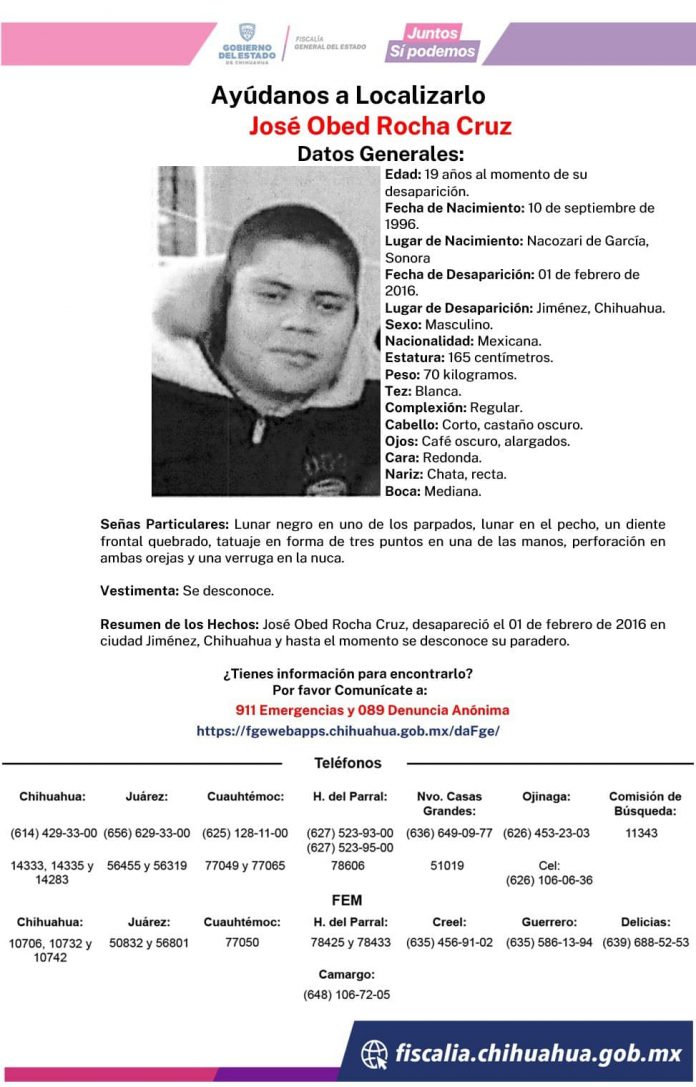 José Obed Rocha Cruz, originario de Nacozari de García, Sonora, tenía 19 años cuando desapareció en Jiménez. Su familia tiene ocho años, 8 meses y 8 días sin saber nada de él y por ello piden ayuda a la ciudadanía para localizarlo.