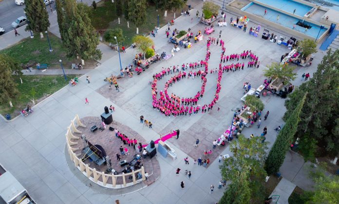 En el marco del evento, se formó un gran moño rosa en la plaza, símbolo de la lucha contra el cáncer de mama, como un acto de solidaridad y esperanza. El presidente municipal, Jesús Valenciano García, y su esposa, Alma Limas de Valenciano, presidenta del DIF, encabezaron la actividad, reafirmando su compromiso con la salud de los habitantes de Delicias.