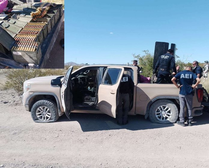 Chihuahua.- Al menos tres vehículos con restos de sangre, armas y una gran cantidad de cartuchos de grueso calibre, como 50, fueron hallados abandonados en una brecha del municipio de Ojinaga, después de que se reportó un topón de malandros.