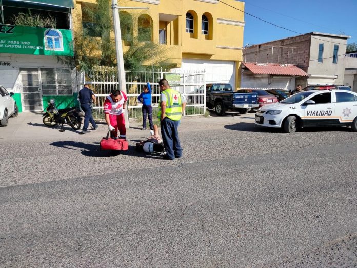 El conductor de la motocicleta Italika 125, color amarillo con negro, sufrió varias lesiones tras colisionar con un automóvil Toyota Corolla gris. Los paramédicos de Cruz Roja Mexicana brindaron atención prehospitalaria antes de trasladarlo al hospital.