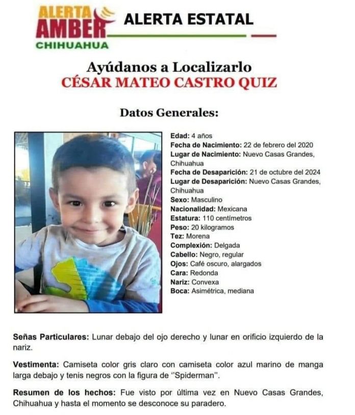 Chihuahua.- César Mateo Castro Quiz, un niño de 4 años, ha desaparecido en Nuevo Casas Grandes. Si tienes alguna información sobre su paradero, es fundamental que llames al 911 o 089. La alerta Amber ha sido activada para garantizar una respuesta rápida y efectiva en la búsqueda del niño.