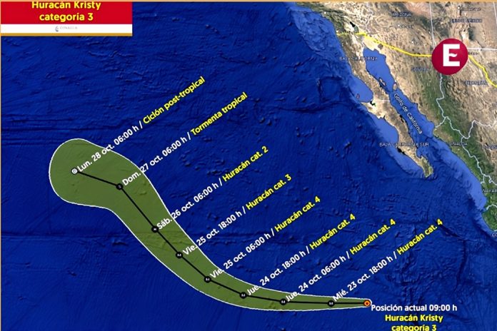La Conagua precisó que el huracán Kristy llegará a la categoría 5 para la madrugada del jueves 24 de octubre mientras se sigue alejando de México y gradualmente se debilitará para regresar a ser una tormenta tropical el domingo y finalente un ciclón post-tropical.