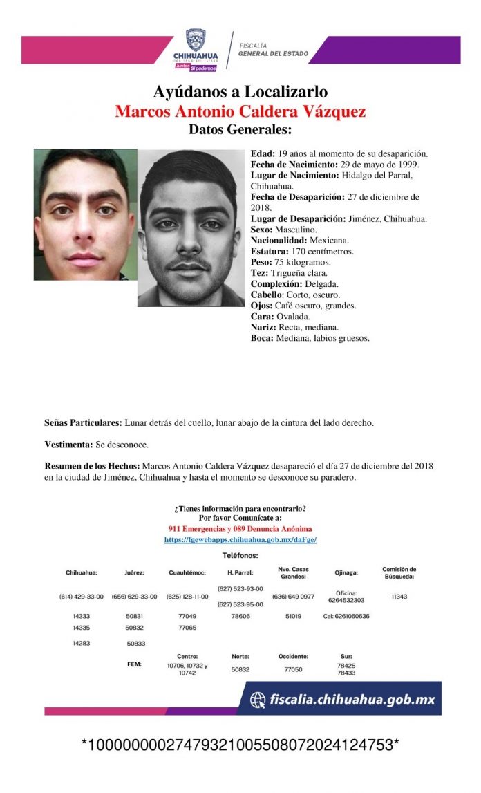 Si cuenta con información que ayude a localizar a Marcos Antonio Caldera Vázquez u otra persona desaparecida, favor de comunicarse al teléfono (627)523-93-00 a la extensión 78606, al Sistema de Emergencias 911, o bien, al 089 para denuncia anónima.