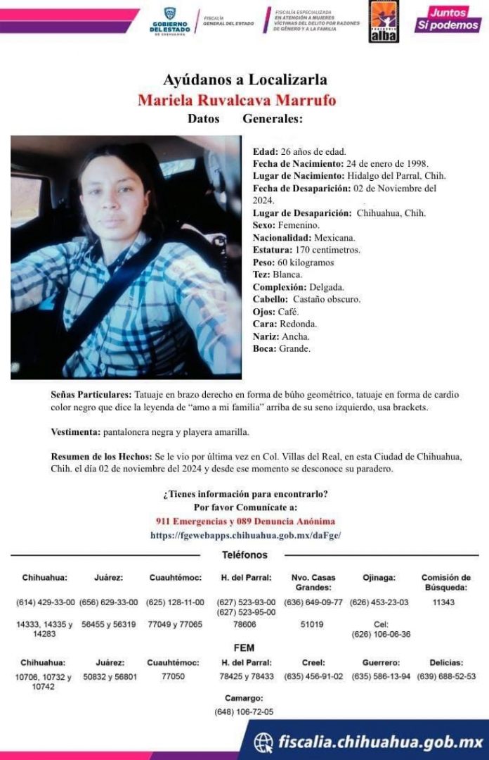 Delicias.- La Fiscalía General del Estado (FGE) emitió una pesquisa para localizar a Mariela Ruvalcaba Marrufo, de 26 años, conductora de la plataforma Didi, quien desapareció después de aceptar un viaje del sábado 2 de noviembre desde la colonia Villas del Real hacia Delicias.