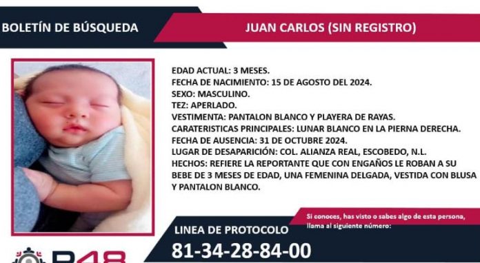 El pequeño Juan Carlos de tres meses de edad, fue localizado en un terreno baldío, justo dos días después de que su madre reportó el robo afuera de una tienda por parte de dos mujeres.