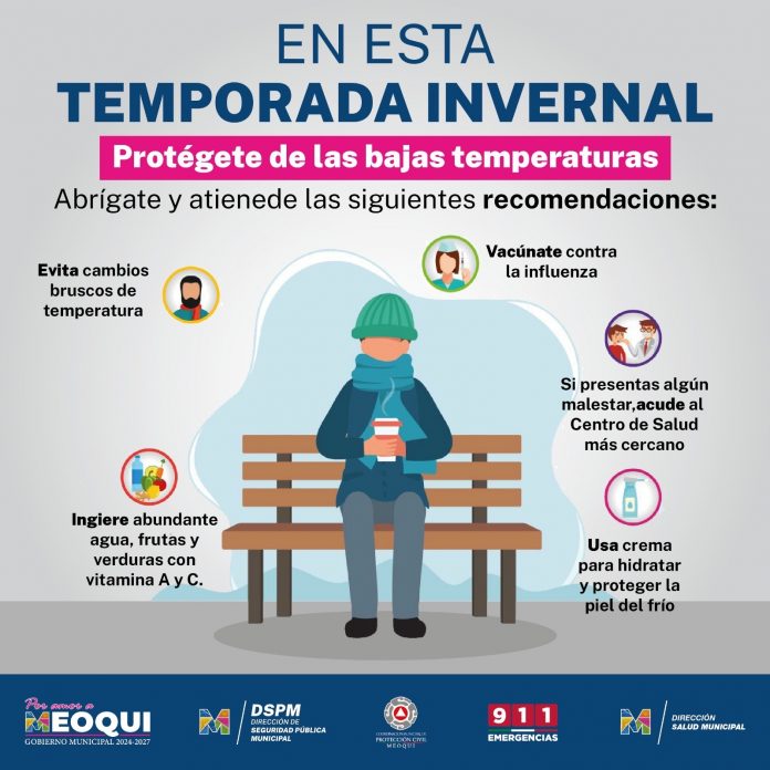 Meoqui.- Ante la llegada del Frente Frio número 7 a la Región Centro Sur con pronostico de temperaturas de hasta 8 grados centígrados durante los próximos días, el Gobierno de Meoqui, a través de la Dirección de Salud Municipal y la coordinación de Protección Civil y Bomberos, emitió una serie de recomendaciones con la finalidad de evitar enfermedades respiratorias, así como cualquier incidente.