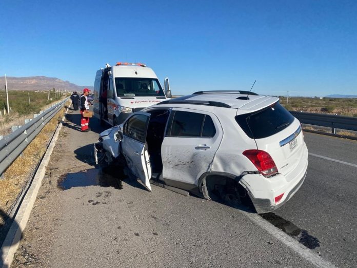 Meoqui.- Esta mañana, un accidente en la carretera Meoqui-Chihuahua dejó múltiples daños materiales en una camioneta Chevrolet Trax. La conductora, Gabriela Janeth V. C., de 46 años, perdió el control del vehículo cuando un neumático reventó en el kilómetro 171, chocando contra el muro de contención.