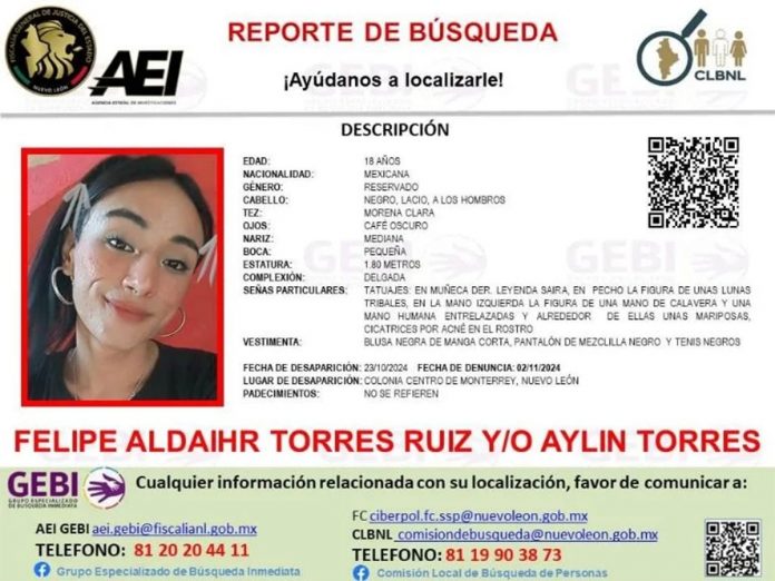 México.- La familia de Aylin Torres, una joven persona trans de 18 años, reportó su desaparición el pasado 2 de noviembre en Nuevo León. La madre de Aylin compartió la noticia en Facebook, solicitando ayuda para encontrar a su hija.