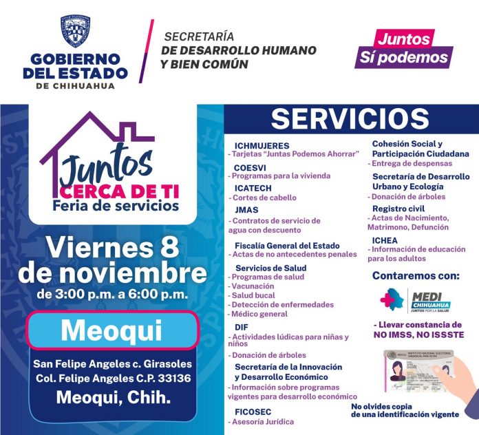 Meoqui.- El Gobierno Municipal de Meoqui a través de la Secretaría de Desarrollo Humano y Bien Común de Gobierno del Estado, llevarán a cabo la feria de servicios “Juntos Cerca de Ti”, gracias a la gestión de la alcaldesa Miriam Soto, se realizará el próximo 8 de noviembre a las 3 de la tarde en la Plaza Principal de la comunidad Felipe Ángeles.