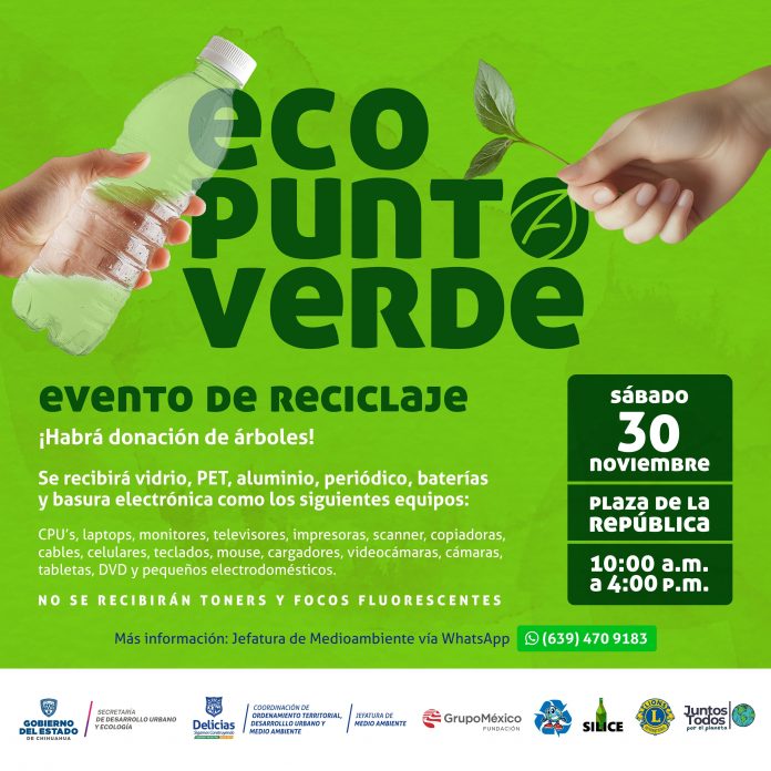 Delicias.- Con el compromiso de seguir impulsando acciones a favor del medioambiente, la Jefatura de Medioambiente de Delicias llevará a cabo el Eco Punto Verde, un evento dedicado al reciclaje que incluirá la donación de árboles. La cita es el próximo sábado 30 de noviembre en la Plaza de la República, en un horario de 10:00 de la mañana a 4:00 de la tarde.