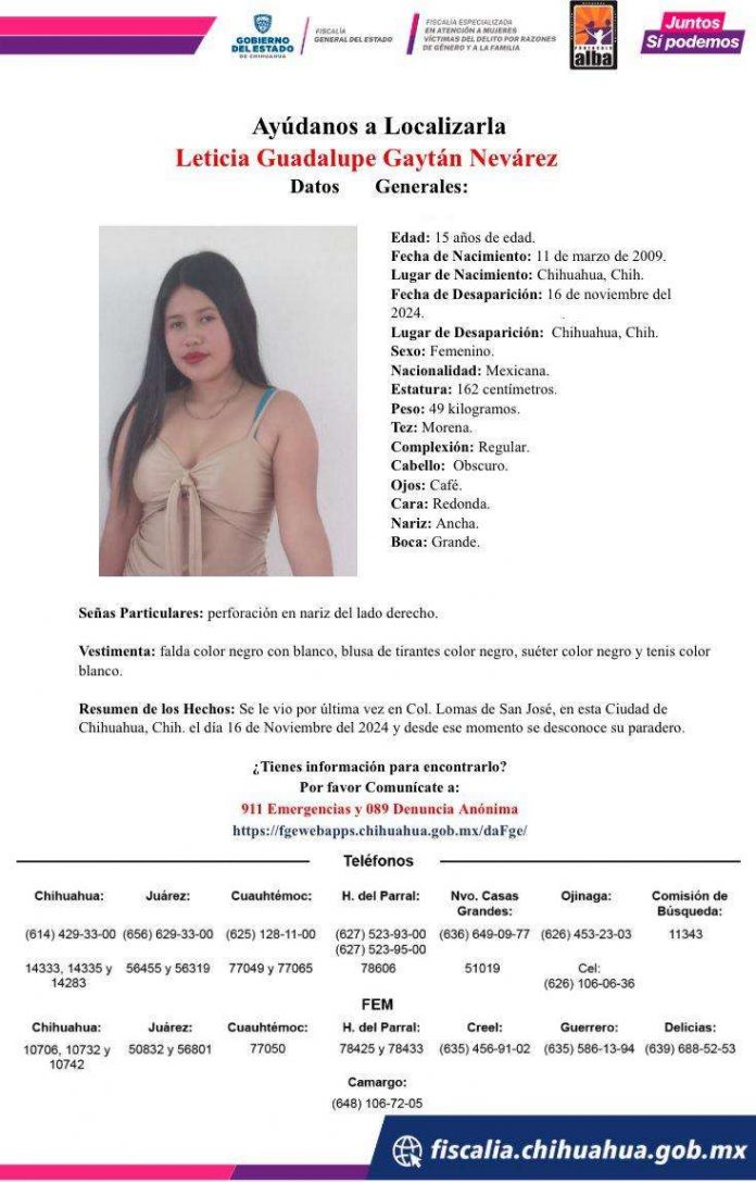 Chihuahua.- La menor, Leticia Guadalupe Gaytán Nevárez, de 15 años, desapareció desde el sábado 16 de noviembre en la ciudad de Chihuahua.